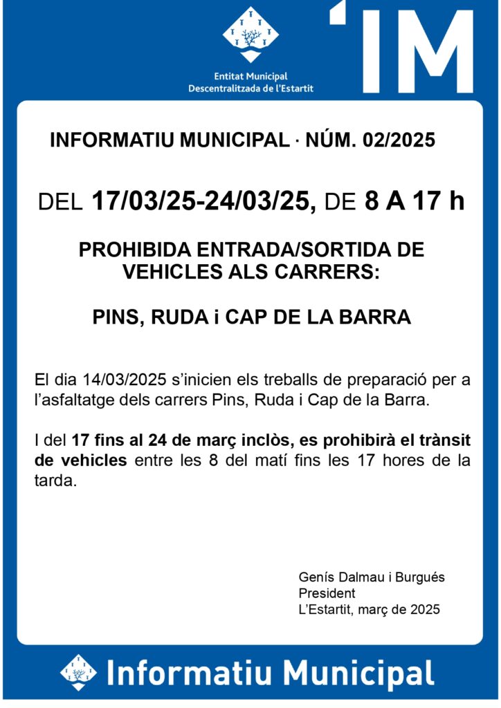 Del 17 al 24 de març inclòs, es prohibirà el trànsit de vehicles, entre les 8 de matí i les 17 h, als carrers Pins, Ruda i Cap de la Barra, per treballs d’asfaltatge.