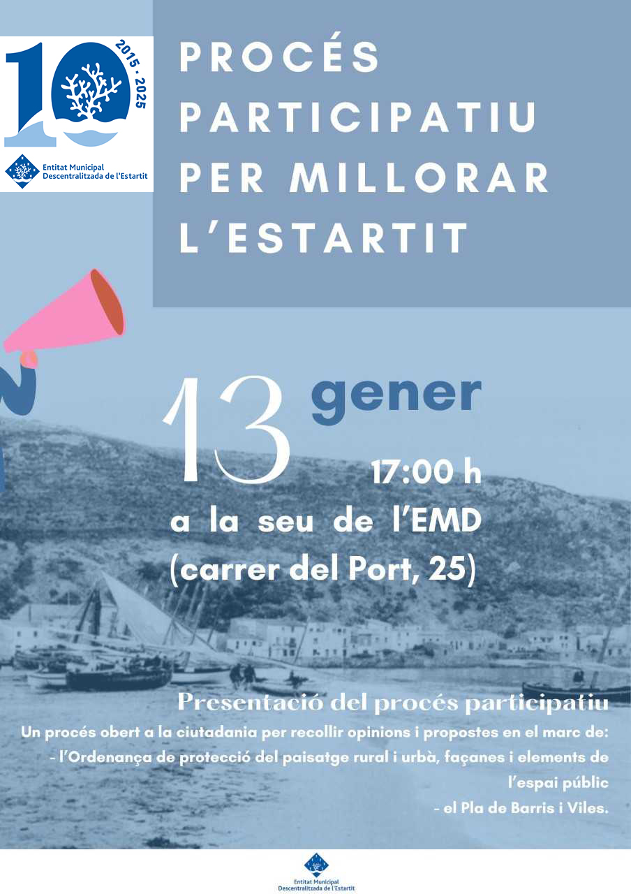 La presentació del procés participatiu tindrà lloc el proper 13 de gener de 2026, a les 17.00 hores, a la seu de l’EMD de l’Estartit (carrer del Port, 25).