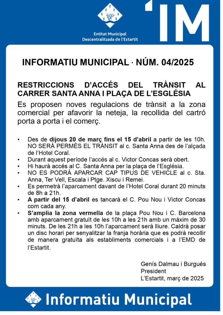 Amb l’objectiu de millorar la neteja, la recollida de cartró porta a porta i afavorir el comerç local, es regulen noves restriccions de trànsit a la zona comercial.