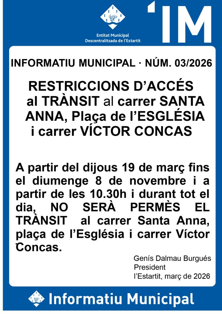 A partir del dijous 19 de març i fins al diumenge 8 de novembre, hi haurà restriccions de trànsit als carrers Santa Anna, Víctor Concas i Plaça de l’Església. A partir de les 10.30 h i durant tot el dia, no es permetrà la circulació de vehicles.